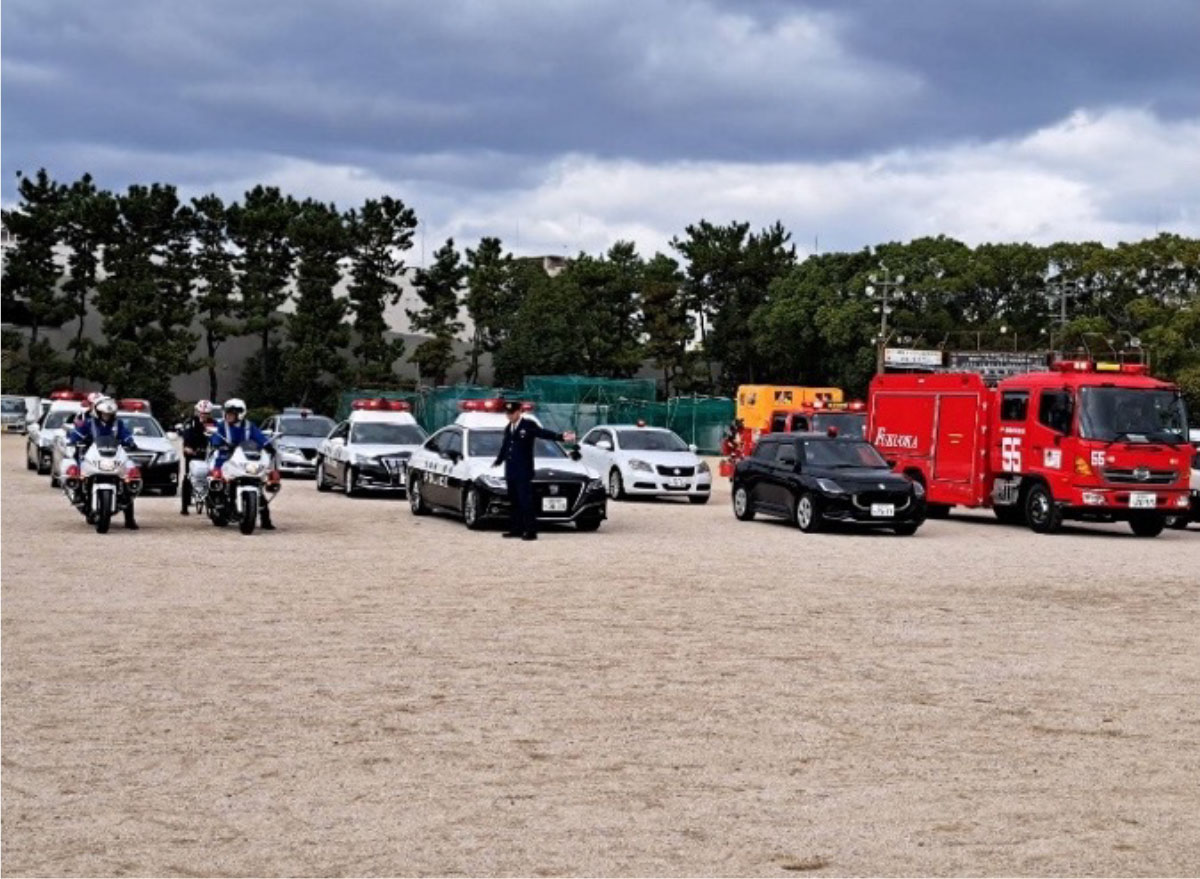 11月28日(金) 午前11時30分から筥崎宮グラウンドにおいて、年末年始の犯罪防止の観点から東警察署・防犯協会による特別警戒出動式が行われました。東警察署員をはじめ地域防犯ボランティア団体、消防署、交通機関企業等が参加し東保護区保護司会から8名が参加しました。