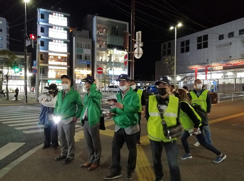 5分区保護司7名は、4月8日(金) 20:00~「JR香椎駅前ロータリー」に集合し、東警察署員と香椎各区PTAや少年補導員の方々と一緒に香椎駅周辺を夜間パトロールしました。